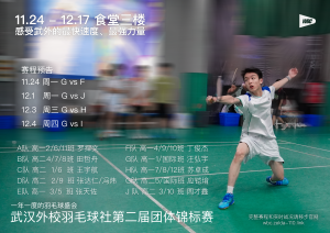 File:武汉外国语学校第二届羽毛球团体锦标赛规则集(第三版).pdf 在副社长雷雪彬的主持下,社团为第二届羽毛球团体锦标赛编写了详细的规则集并两次修改。